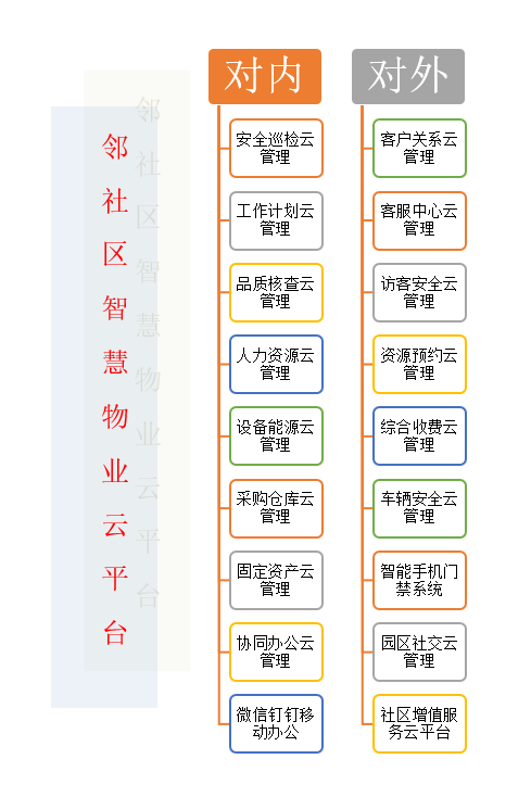 成都優(yōu)家生活科技有限公司自主研發(fā)的“鄰社區(qū)”智慧物業(yè)管理ERP+CRM+OA云平臺定位于物業(yè)企業(yè)的內部管理流程優(yōu)化及與客戶的溝通改善,涉及物業(yè)管理的所有流程和模塊,一個平臺,多種功能。無需多平臺多軟件切換,數據統(tǒng)一,便于對管理深入分析??梢源蟠髱椭飿I(yè)企業(yè)提高工作效率、降低成本,提高客戶滿意度。也幫助物業(yè)服務企業(yè)管理者及時了解經營數據,科學進行經營決策。 主要包括以下模塊: